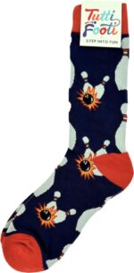 Voor de echte bowlingliefhebber zijn deze sokken van Tutti Footi een absolute must-have. Met een speels patroon van bowlingpins en bowlingballen, gecombineerd met een opvallend blauw en oranje design, zijn deze sokken een geweldig cadeau voor elke bowler.