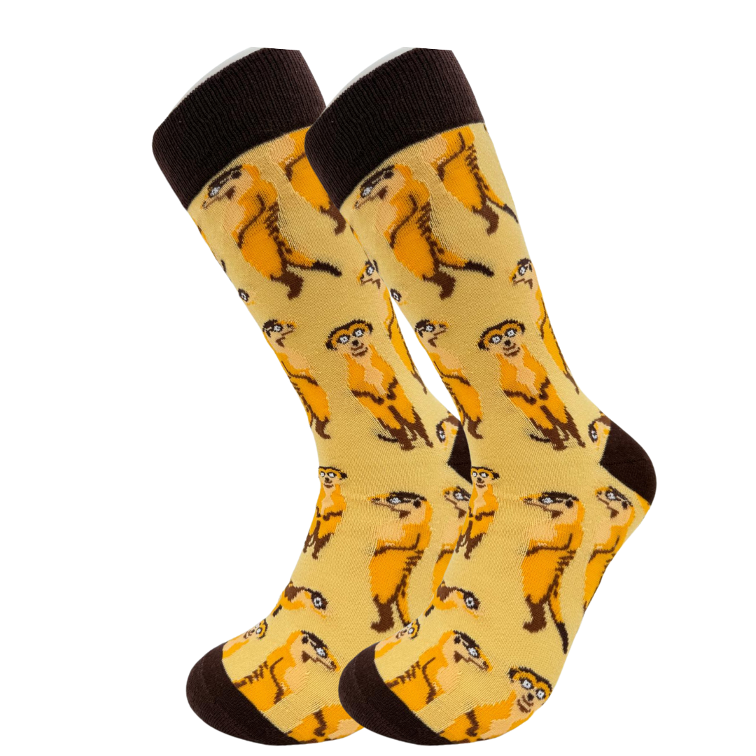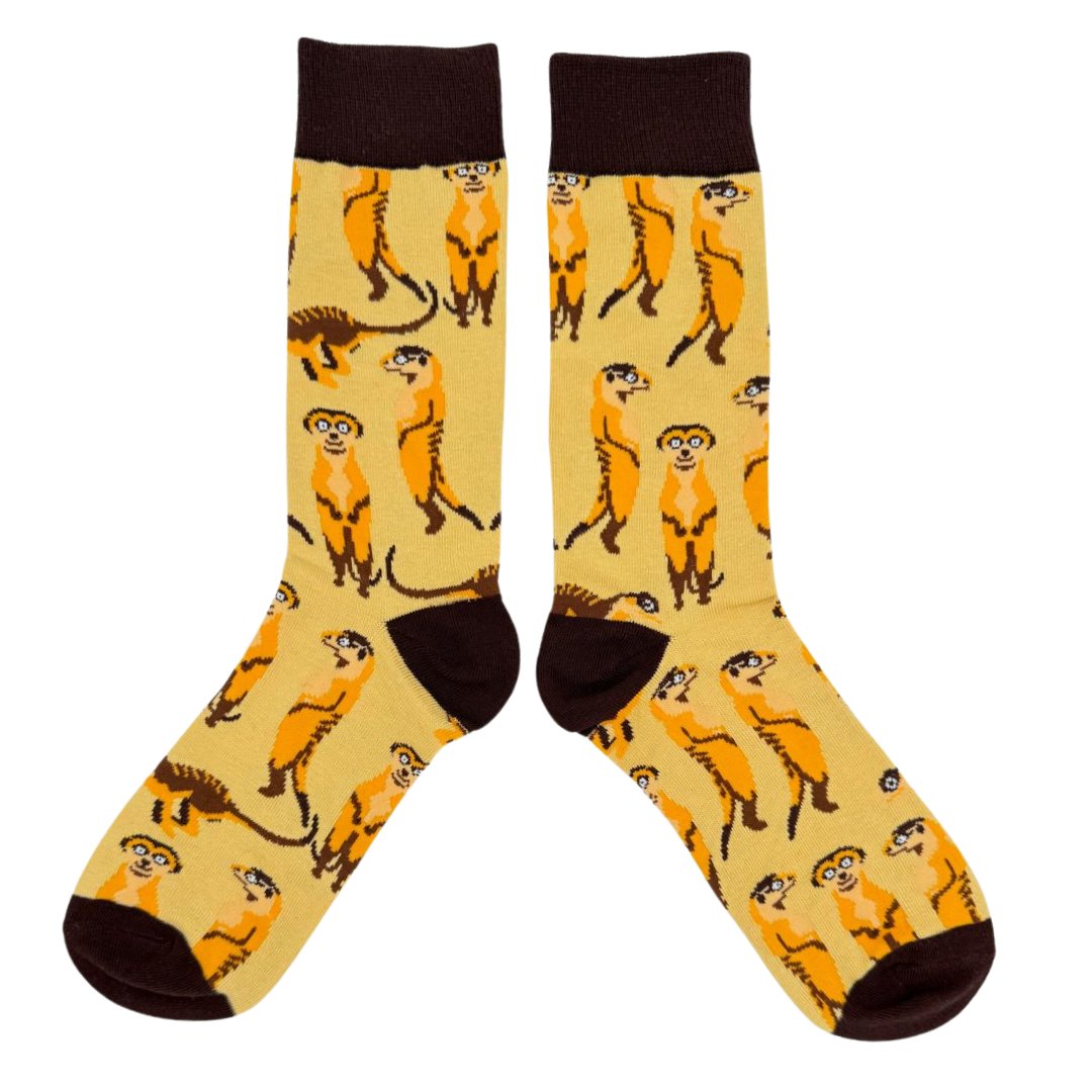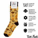 Met deze Tutti Footi stokstaartjessokken haal je een stukje savanne naar je garderobe. Het vrolijke gele design met stokstaartjes maakt deze sokken een echte eyecatcher. Perfect om je outfit een unieke twist te geven en heerlijk comfortabel om te dragen.
