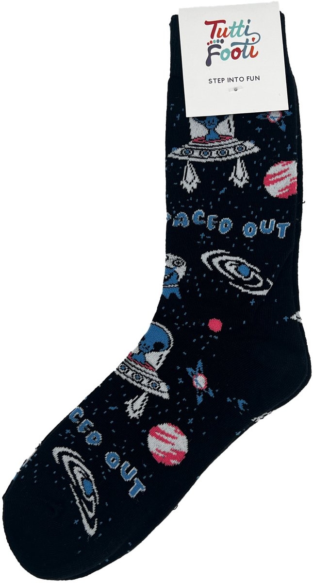 Ben jij klaar voor een intergalactisch sokkenavontuur? Met deze Tutti Footi ruimte sokken lijkt het net alsof je rechtstreeks uit een UFO bent gestapt. Blauwe aliens, vliegende schotels, sterren en planeten… alles komt samen op deze sokken vol humor en fantasie. Perfect voor wie graag een beetje buiten de lijntjes (en de dampkring) kleurt.