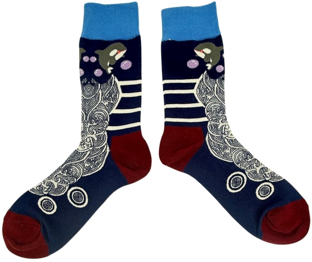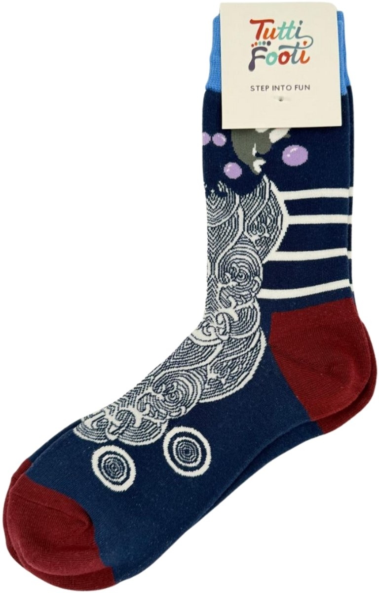 Comfortabele uniseks sokken met artistiek golf- en vismotief. Gemaakt van een zachte en ademende katoenmix. De sokken hebben een comfortabele pasvorm (maat 38-43) en combineren diepe blauwtinten met een bordeauxrode boord.