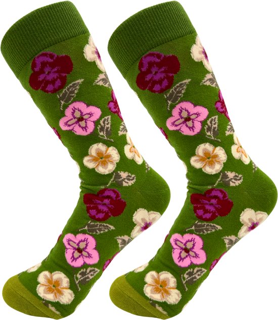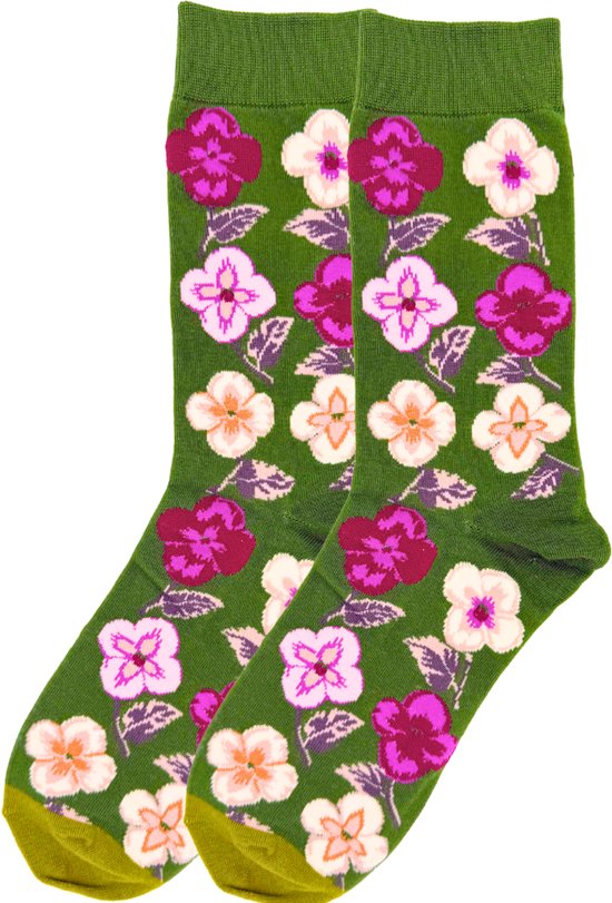Laat je voeten bloeien met deze kleurrijke sokken vol bloemen! Het speelse ontwerp met roze, crèmekleurige en paarse viooltjes op een groene achtergrond maakt van elke outfit iets bijzonders. Ideaal voor wie houdt van tuinieren, natuur of gewoon een vrolijk accent in de dag wil brengen.